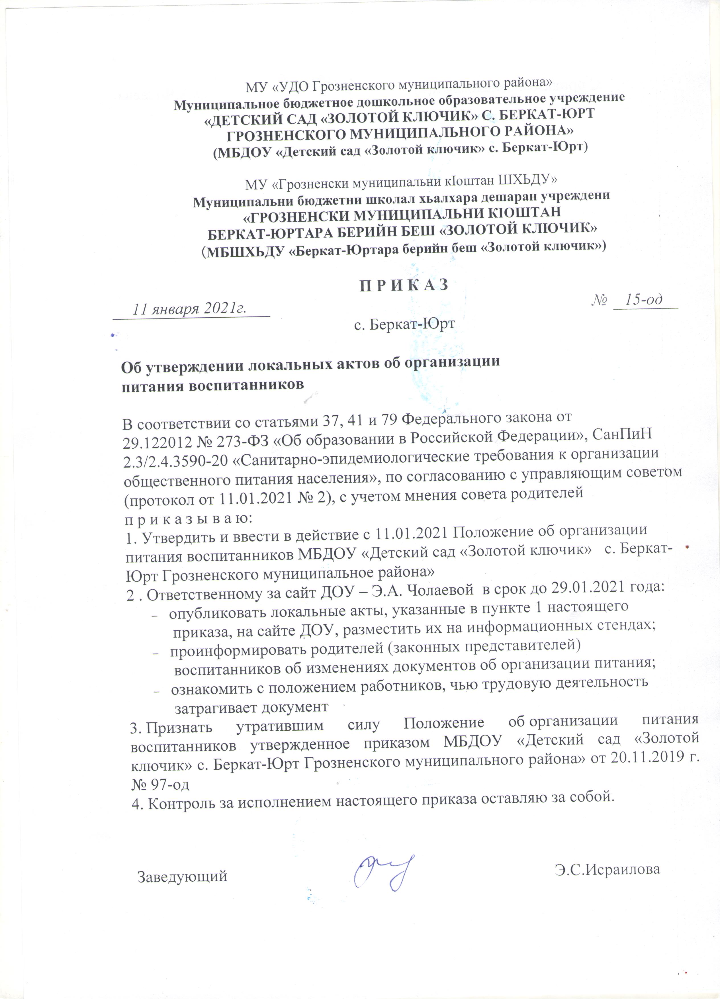 Приказ "Об утверждении локальных актов об организации питания воспитанников".