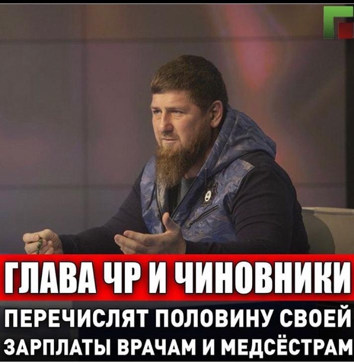 Через оперативный штаб к нему обратились члены правительства, депутаты парламента, главы районных и поселковых муниципальных образований, руководители управлений, отделов, ведомств, командный состав подразделений МВД и УФСВНГ РФ по ЧР, начальники отделов полиции и другие с предложением перечислить половину месячной зарплаты на счёт поддержки врачей и медсестёр, работающих с больными Covid-19. Руководитель региона поддержал эту инициативу. «Искренно благодарен всем, кто решил помочь медицинским работникам! Они этого заслужили своим героическим трудом! Данное решение ещё раз подтвердило, что в команде, основанной Первым Президентом ЧР, Героем России Ахмат-Хаджи Кадыровым трудятся настоящие патриоты Отечества, достойные сыны Нохчийчоь, готовые на любые поступки ради народа. Глубоко признателен всем, кто не остался в стороне от всеобщего дела спасения нации от невиданной ранее угрозы», - написал Кадыров.