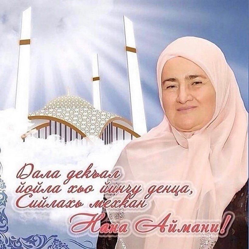 Дорогие друзья! Одна из выдающихся личностей в истории России, эталон Чеченской женщины, Мать, воспитавшая достойных сыновей и дочерей, женщина, олицетворяющая собой истинный пример духовности и доброты, святой материнской любви, достоинства и чести, уважаемая АЙМАНИ НЕСИЕВНА КАДЫРОВА отмечает свой день рожденья! Она является президентом РОФ им. ПЕРВОГО ПРЕЗИДЕНТА ЧР, ГЕРОЯ РОССИИ АХМАТА-ХАДЖИ КАДЫРОВА (Дала г1азот къобал дойла цуьнан). Тысячи людей в нашей республике и за ее пределами совершенно искренне называют ее МАМОЙ и бесконечно благодарны ей за нескончаемый поток благих дел, за безгранично доброе сердце, за жизнь, посвященную заботе о людях. Уважаемая АЙМАНИ НЕСИЕВНА! Примите самые теплые поздравления с Днем Вашего рождения! От всей души желаю Вам крепкого здоровья, счастливого долголетия, мира, благополучия! Пусть Всевышний АлЛах1 хранит Вас, Ваших родных и близких! Дала декъал йойла Хьо, тхан мехкан НАНА!