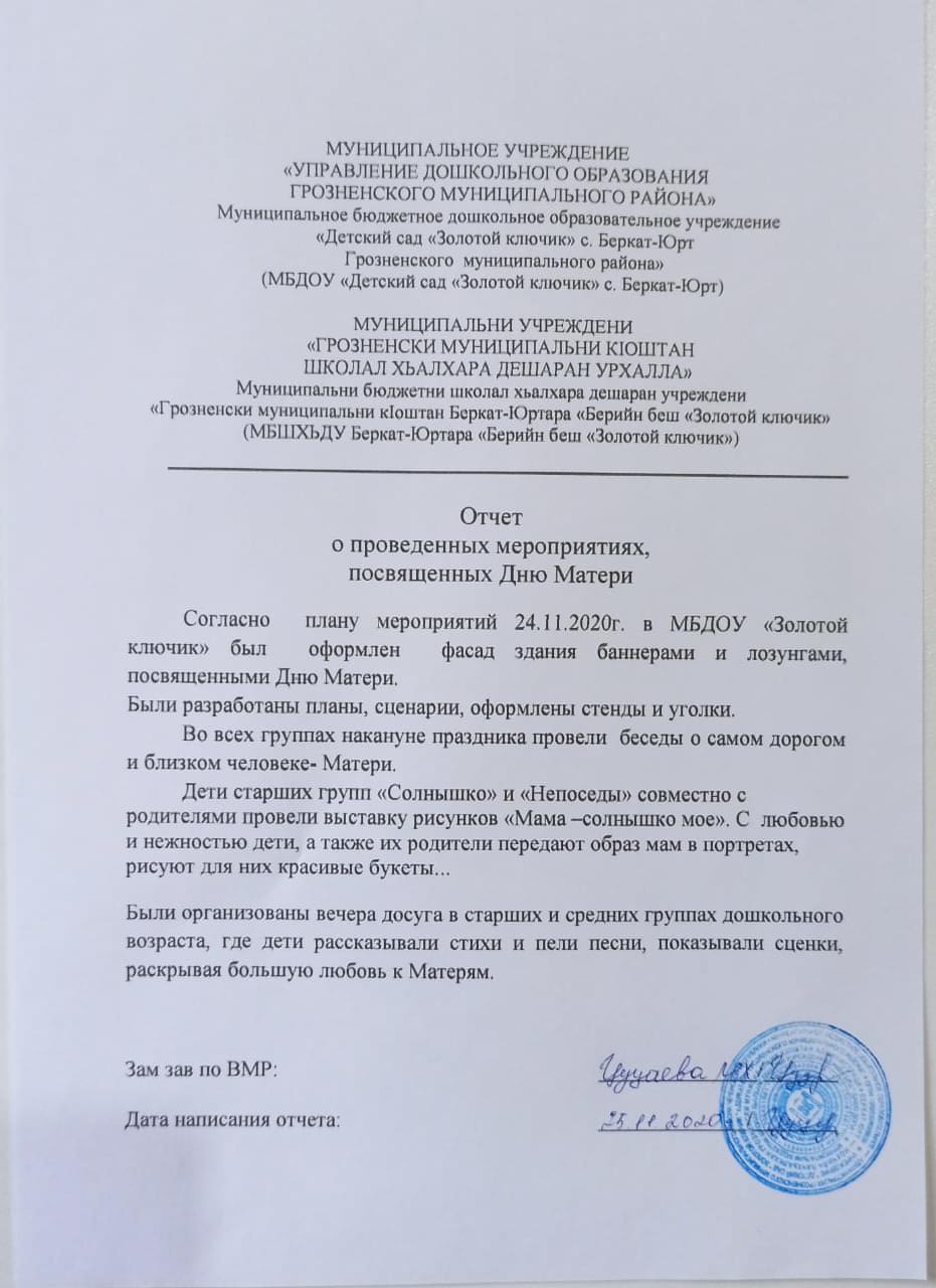 Отчёт о проведенных мероприятиях, посвященных Дню Матери