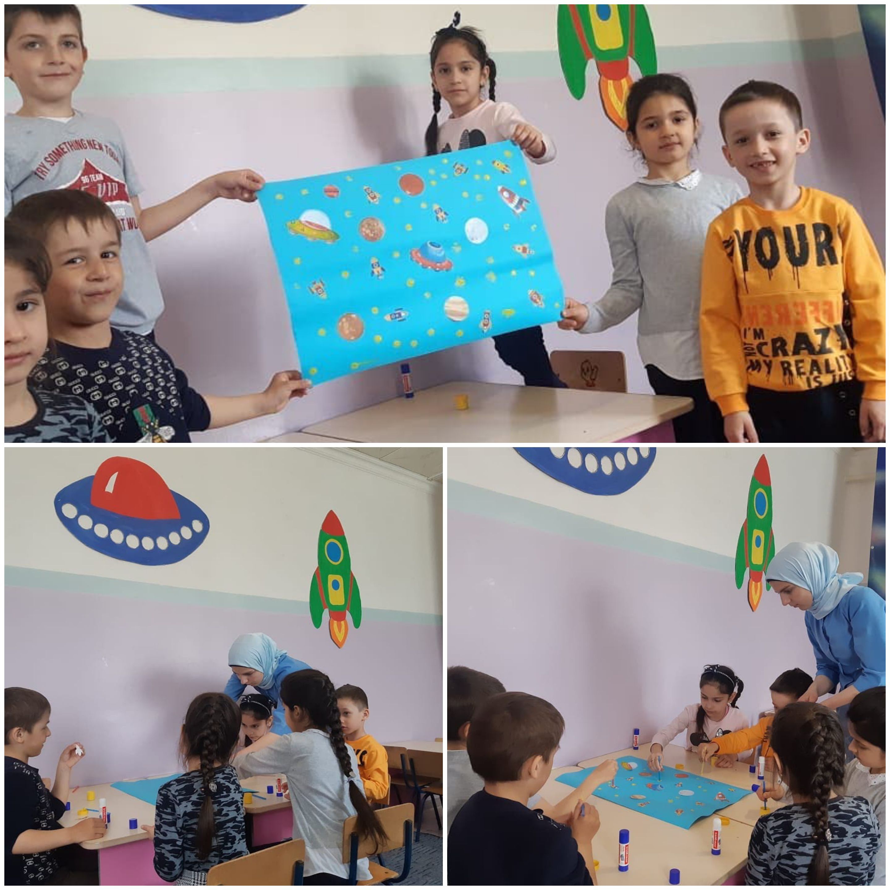 Знания, полученные в детском саду, дети закрепили в своих творческих работах. Дети сделали совместную аппликацию "Полет в космос"