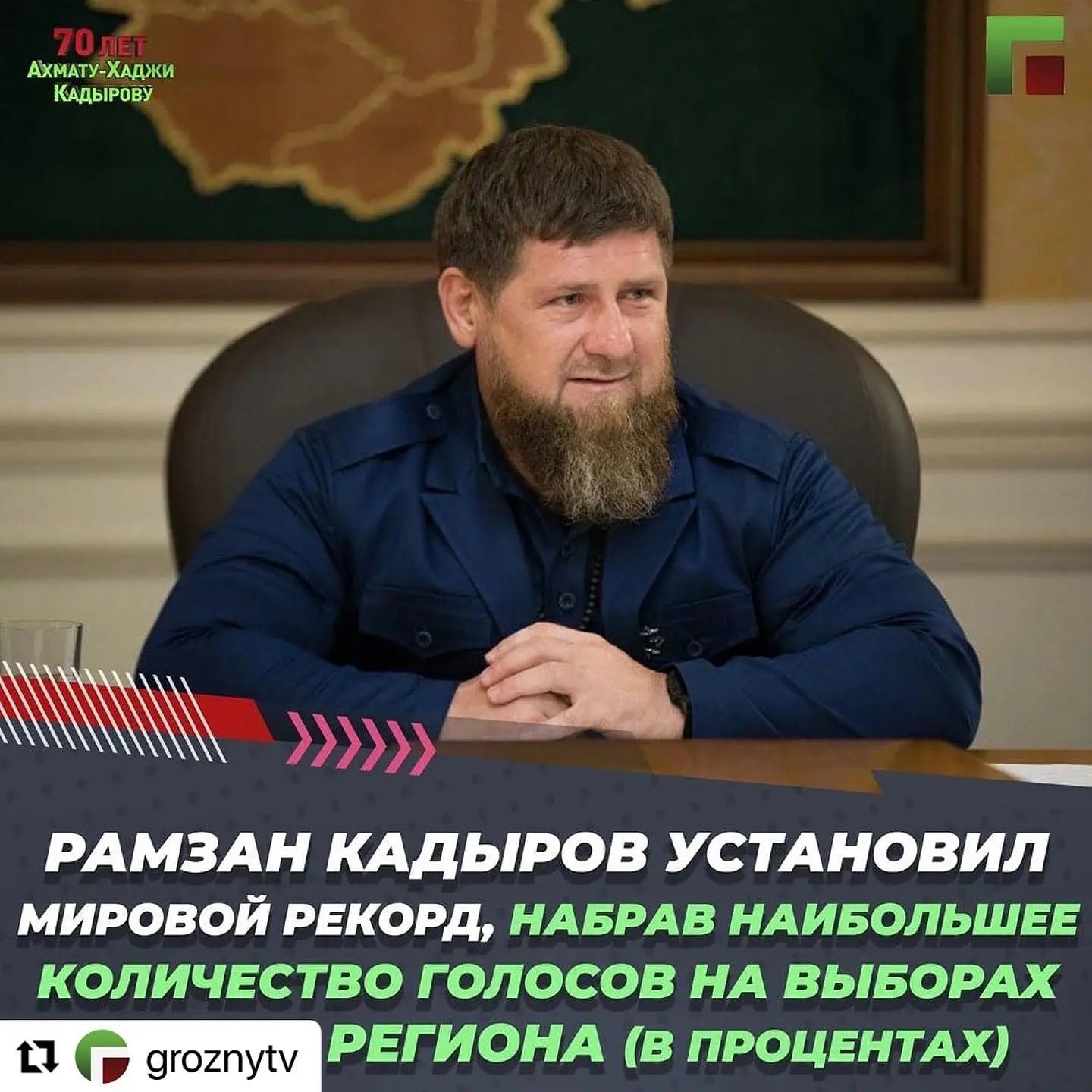 Наибольшее количество голосов на выборах главы региона (в процентах) -99,7%, достигнуто Рамзаном Кадыровым (Россия) на выборах Главы Чеченской Республики. Такие данные публикует крупнейшее международное агентство регистрации рекордов "Интеррекорд" @www_interrecord_ru⠀