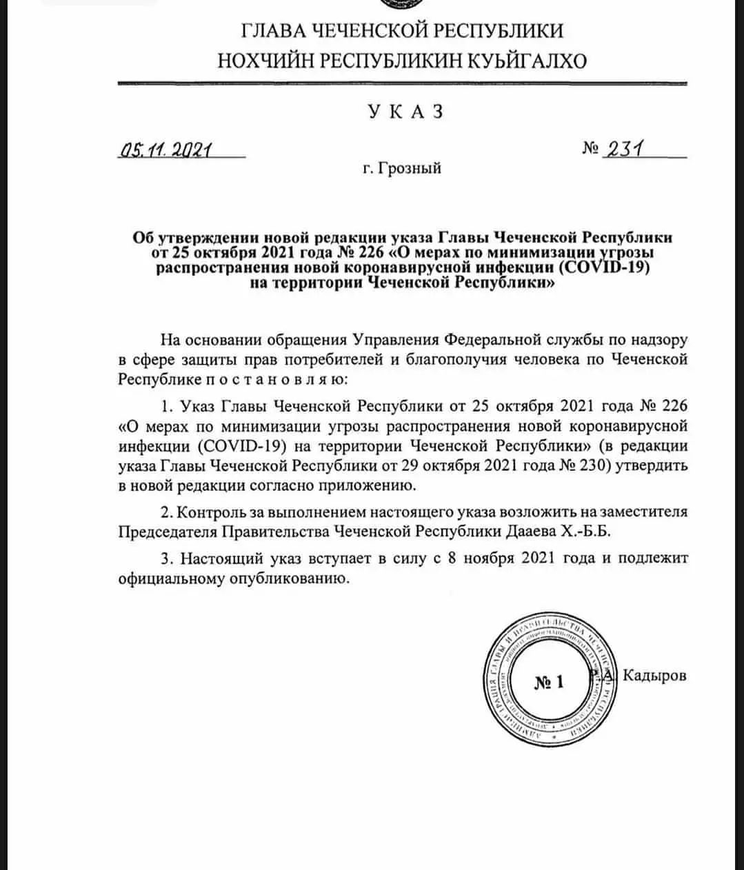 Глава Чеченской Республики, Герой России Рамзан Ахматович Кадыров подписал указ «Об утверждении в новой редакции указа Главы Чеченской Республики от 25 октября 2021 года №226 «О мерах по минимизации угрозы распространения новой коронавирусной инфекции (COVID-19) на территории Чеченской Республики», согласно которому регламентируется деятельность юридических лиц, организаций, индивидуальных предпринимателей и граждан республики на период распространения коронавирусной инфекции и предоставляются необходимые рекомендации для предотвращения