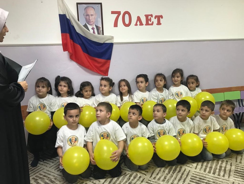 В МБДОУ «Детский сад «Золотой ключик» Грозненского муниципального района» провели с воспитанниками старшей группы «Солнышко» беседу о жизни Владимира Владимировича, где ребятам рассказали о подвигах и политических деяниях президента России. Дети с большим вниманием слушали воспитательницу Мовсарову Э.И. и участвовали в беседе.